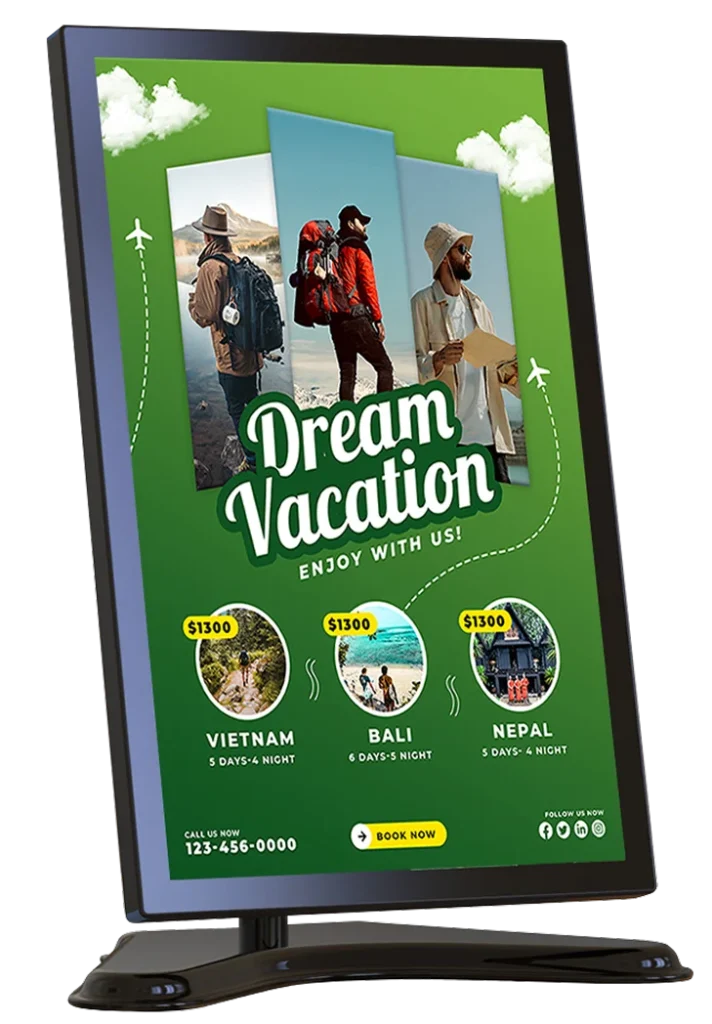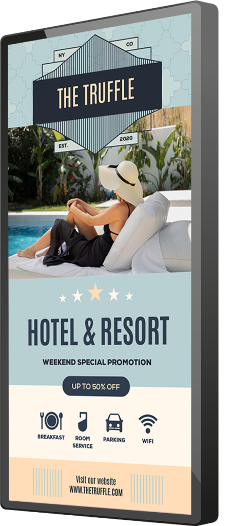 Pantalla en recepción de hotel, con publicidad en alianza con agencia de tours.